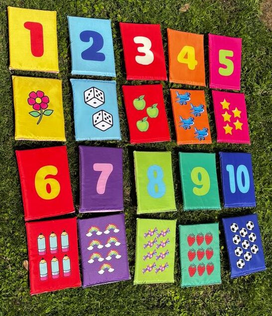 Este juego lúdico está diseñado para que los más pequeños aprendan los números del 1 al 10 asociándolos con imágenes impresas divertidas y llenas de color. Cada pieza está fabricada en goma espuma acolchonada, y forrada con tela impresa de alta calidad, suave al tacto, resistente y fácil de limpiar.